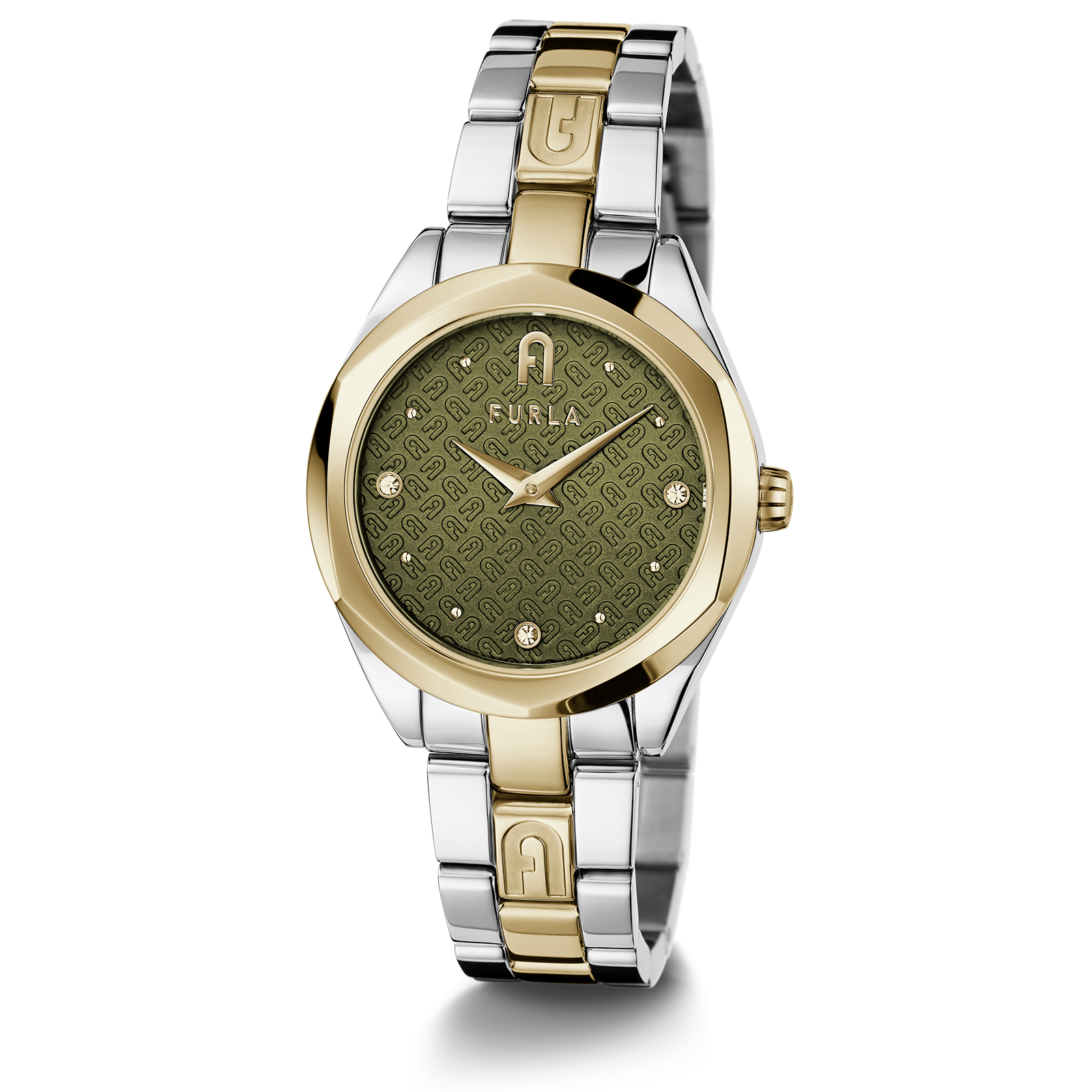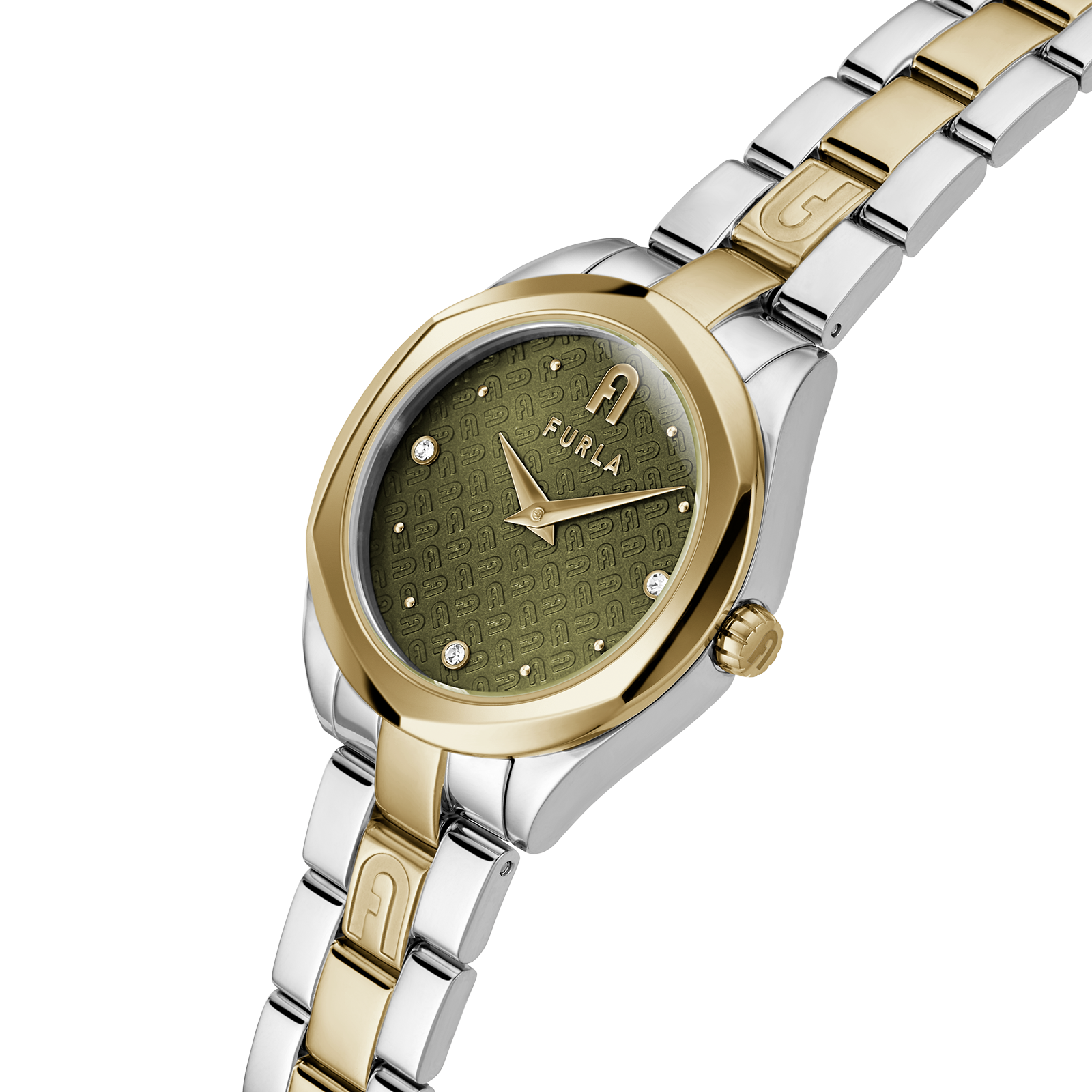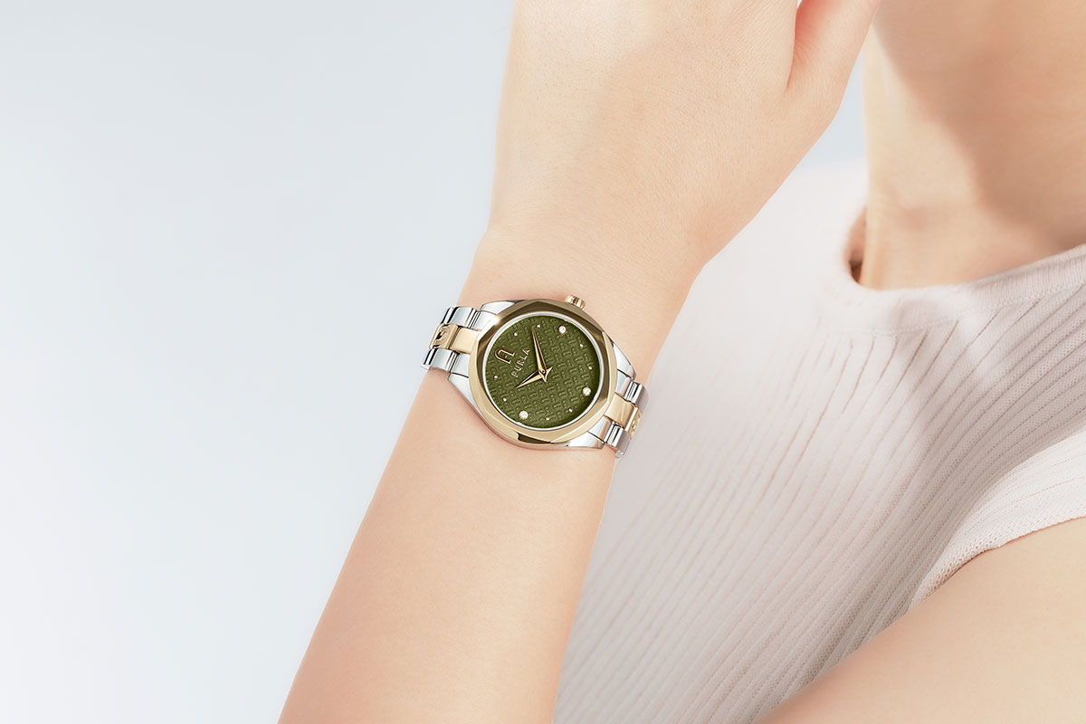 『FURLA PETITE SHAPE(フルラ プチ シェイプ)』は、きちんと感を醸しつつ、カーキのダイヤルとインデックスのストーンが程よい抜け感と女らしさをプラスする腕時計コレクションです。