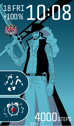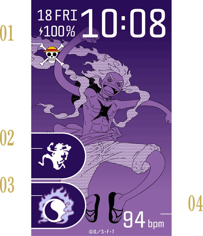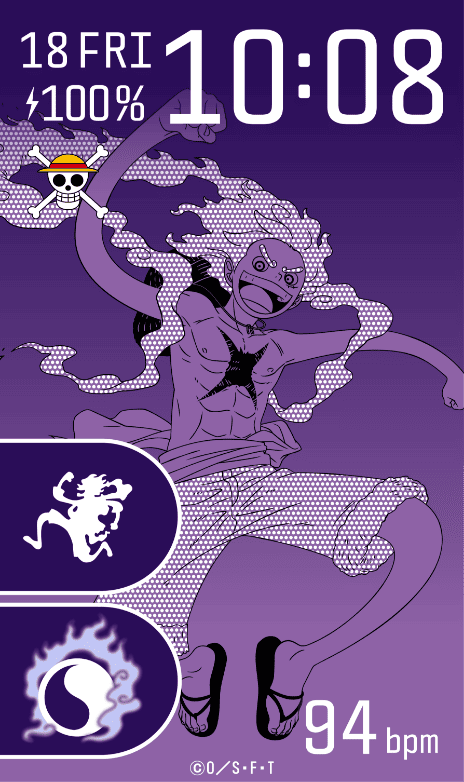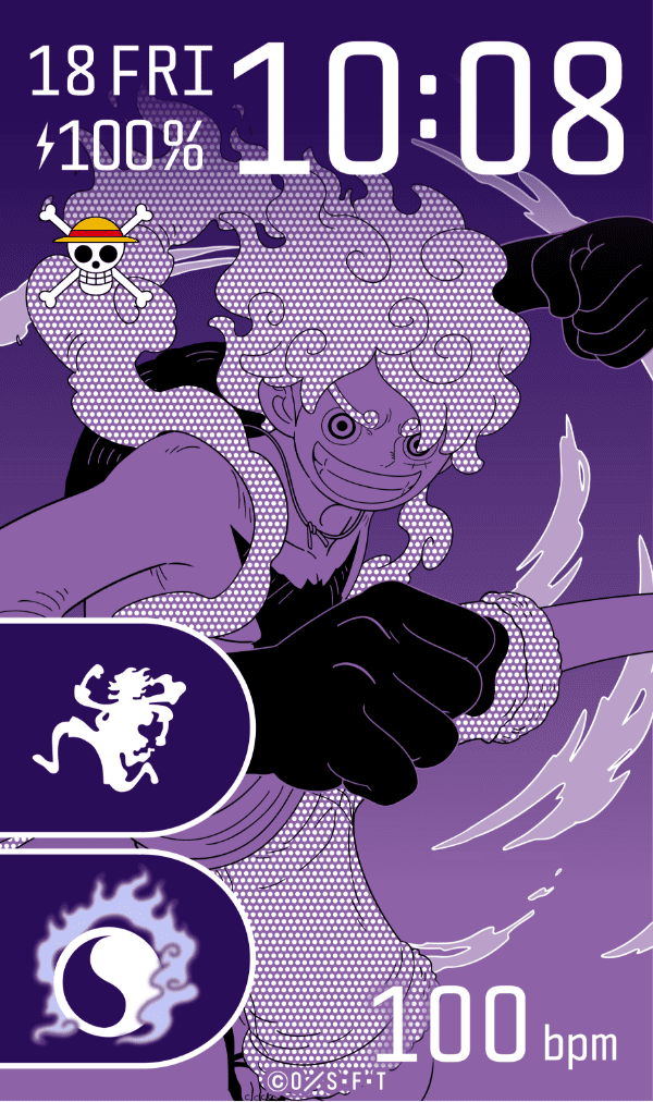 ワンタッチ操作でワークアウトモードを起動可能。”ギア5”ルフィのシルエットをデザインしたアイコンです。